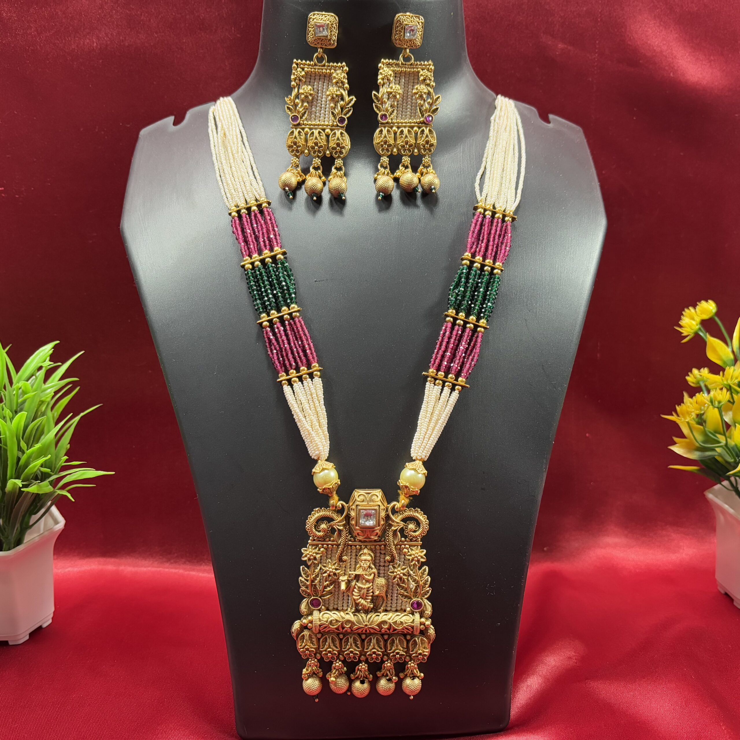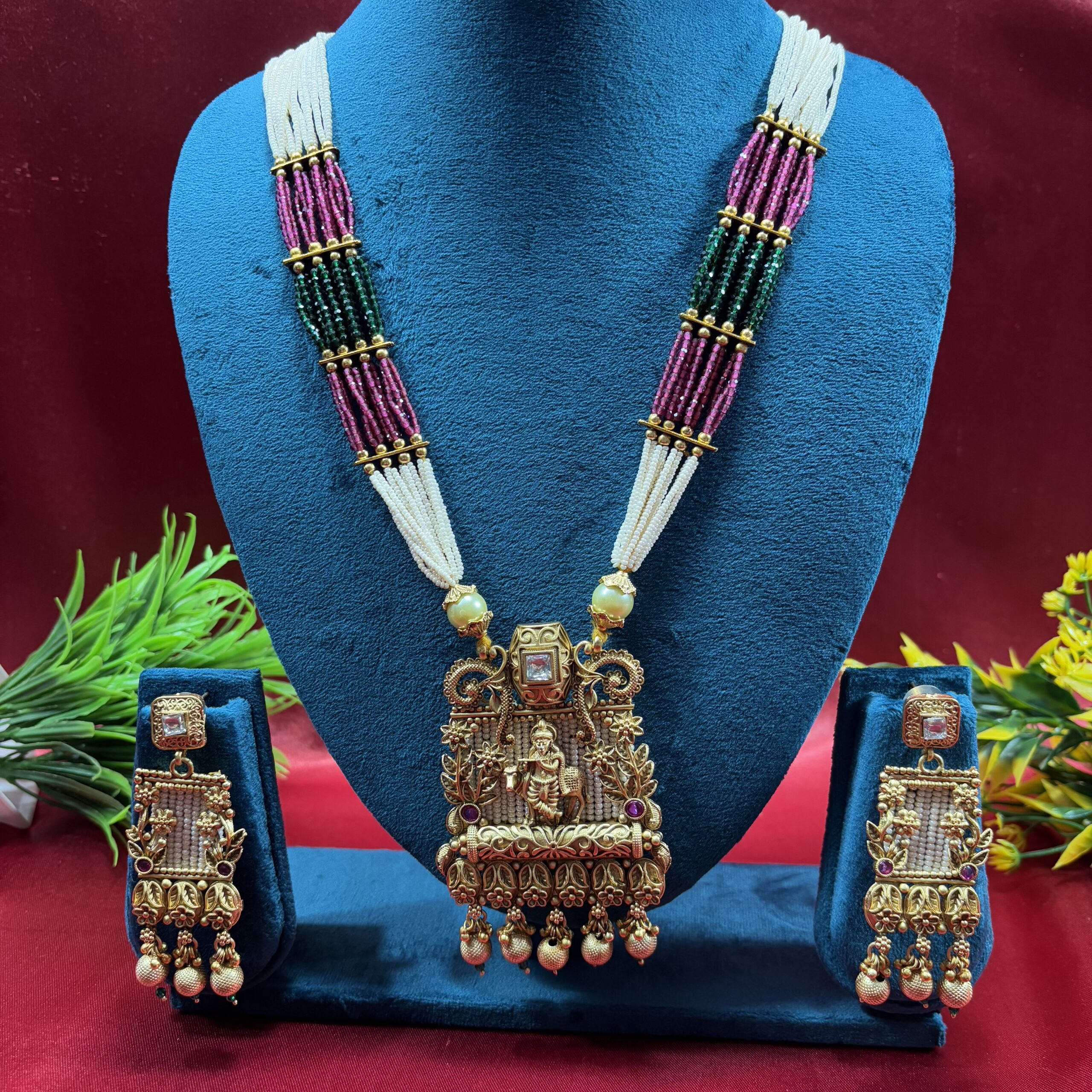 Experience timeless devotion and beauty with the Shevora High Quality Divine Krishna Pearl Necklace, a stunning piece inspired by temple art and divine craftsmanship.